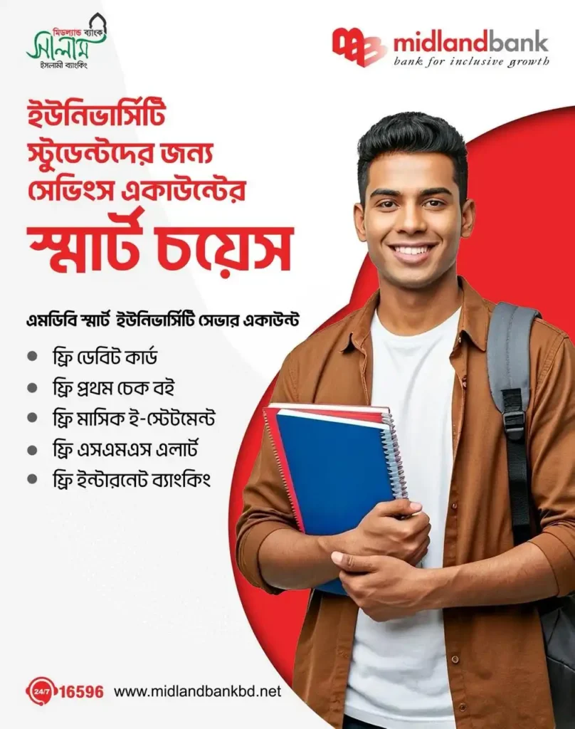 Midland Bank এর স্টুডেন্ট একাউন্টের নাম MDB Smart University Saver। বয়সসীমা ১৮ থেকে ২৫ বছর।