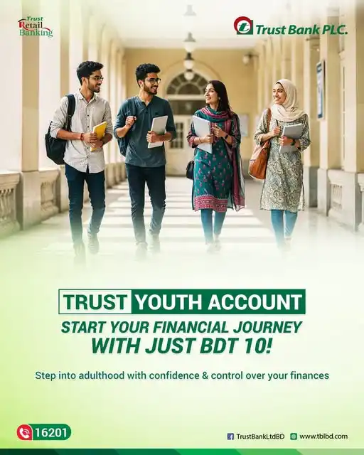 Trust Bank এর স্টুডেন্ট একাউন্টের নাম Trust Youth Account। বয়স ১৮ থেকে ৩০ বছরের মধ্যে হলেই এই একাউন্ট খোলা যায়। এটি বাংলাদেশের স্টুডেন্ট একাউন্টগুলোর মধ্যে অন্যতম সেরা একাউন্টগুলোর একটি।